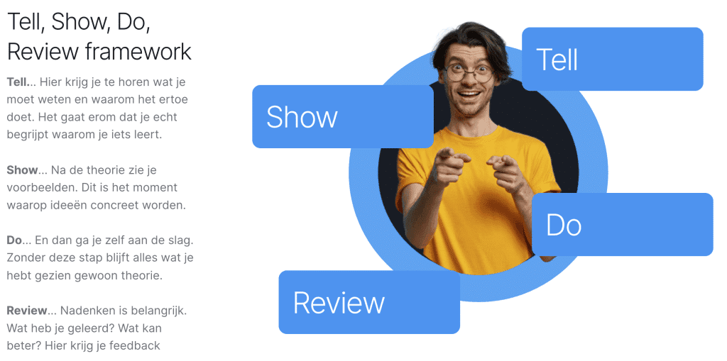 Tell… Waarom is dit belangrijk? Het begint allemaal met vertellen. Hier krijg je te horen wat je moet weten en waarom het ertoe doet. Het gaat niet alleen om het geven van informatie… het gaat erom dat je echt begrijpt waarom je iets leert.